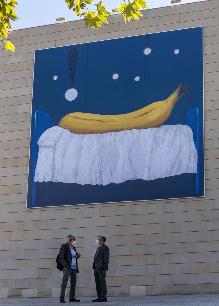 El artis­ta de Xàti­va, Artur Heras, y el dire­tor del IVAM, José Miguel G. Cor­tés, pre­sen­ta­ron la inter­ven­ción de Artur Heras para la facha­da del cen­tro, titu­la­da “Plà­­tan-sie­s­­ta”, que podrá ver­se has­ta el 10 de mar­zo y vie­ne a sus­ti­tuir la ante­rior inter­ven­ción, de Miquel Nava­rro.