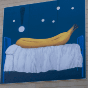 Sobre la figu­ra del plá­tano dur­mien­te se alza un gran sím­bo­lo de inter­jec­ción, una cabe­za en excla­ma­ción, que for­ma entre otros pun­tos un peque­ño mapa de cons­te­la­cio­nes, un agu­je­ro por don­de se cue­lan y des­apa­re­cen los sue­ños…