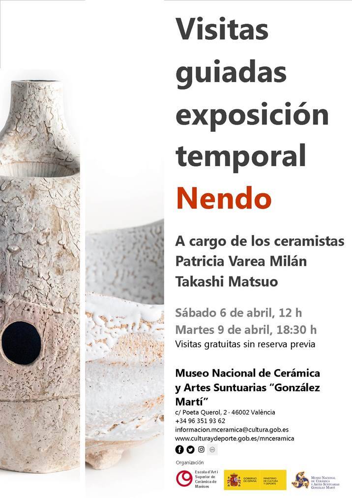 El sábado 6 de abril a las 12:00h y el martes 9 de abril a las 18:30h tendrán lugar unas visitas guiadas a la exposición Nendo, a cargo de los dos ceramistas participantes: Patricia Varea Milán y Takashi Matsuo que descubrirán los secretos de elaboración de sus obras. Las visitas son gratuitas y no necesitan reserva previa.