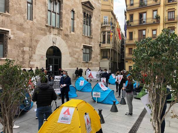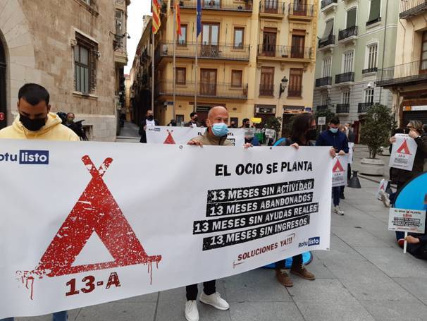De este modo y par­tir de hoy, con el eslo­gan gené­ri­co EL OCIO SE PLANTA y los has­tags #13A y #13Meses, se lle­va­rán a cabo dife­ren­tes actos y men­sa­jes duran­te la acam­pa­da, para recla­mar que des­de el Gobierno valen­ciano se apor­ten “solu­cio­nes urgen­tes y rea­lis­tas y no meros par­ches eco­nó­mi­cos”. De hecho, no darán mar­cha atrás has­ta tener sobre la mesa un PLAN DE RESCATE ECONÓMICO que empie­ce por inyec­tar ya, los 8 millo­nes de euros com­pro­me­ti­dos den­tro del Plan Resis­tir, como ayu­das espe­cí­fi­cas para sal­var el ocio noc­turno, y que se amplíen los recur­sos para cubrir todas las soli­ci­tu­des de las empre­sas del ocio noc­turno que han soli­ci­ta­do estas ayu­das. Al res­pec­to, seña­lan que las pre­vi­sio­nes ini­cia­les del Con­sell eran las de ayu­dar solo a 700 empre­sas, mien­tras que el núme­ro de empre­sas soli­ci­tan­tes sobre­pa­sa las 1.000.