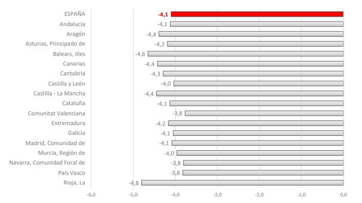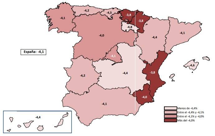 Estos datos sitúan a la Comunitat Valenciana con mejores resultados que la media española, cuya caída del PIB respecto al anterior trimestre fue de 5,2%, situándose su tasa interanual en el 4,1%. De hecho, la valenciana es, junto con País Vasco y Navarra, una de las tres comunidades autónomas donde el descenso del PIB fue moderadamente inferior al resto. A ellas se suma la Región de Murcia, que con un 4% también se situó por encima de la media.