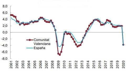 Este comportamiento hace que el impacto de la recesión económica provocada por la pandemia sea muy distinto del registrado en la crisis de 2008. En aquella coyuntura el fuerte peso de la construcción hizo que la crisis tuviera una especial incidencia para la economía valenciana, siendo mucho más acentuada la incidencia del estallido de la burbuja inmobiliaria que en el resto del país.