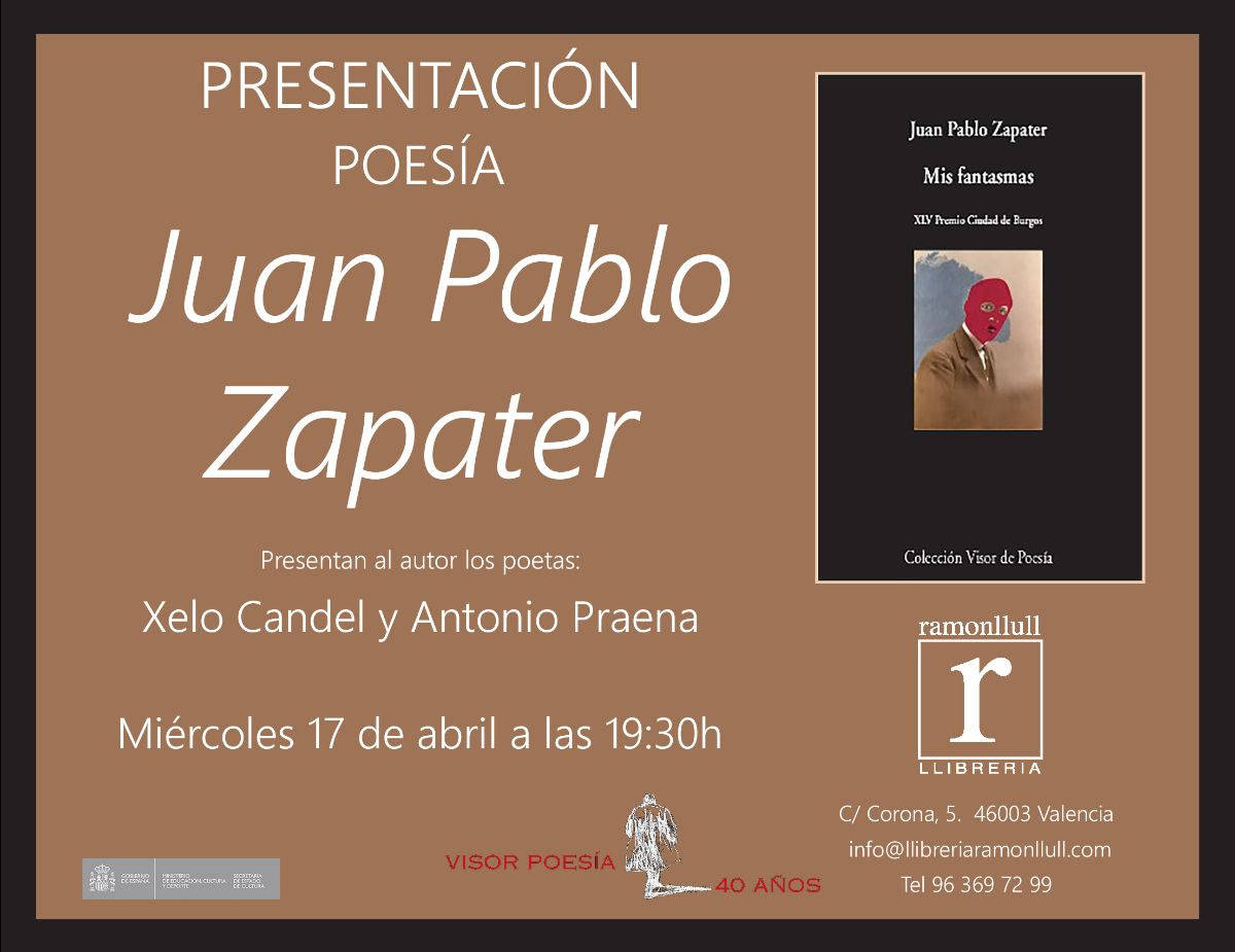 El próximo miércoles 17 se celebra la salida del nuevo libro del poeta Juan Pablo Zapater, Mis fantasmas (Ed.Visor), en la librería Ramón Llull. Para esta especial puesta de largo contarán con la presencia, junto al autor, de los poetas Antonio Praena y Xelo Candel.