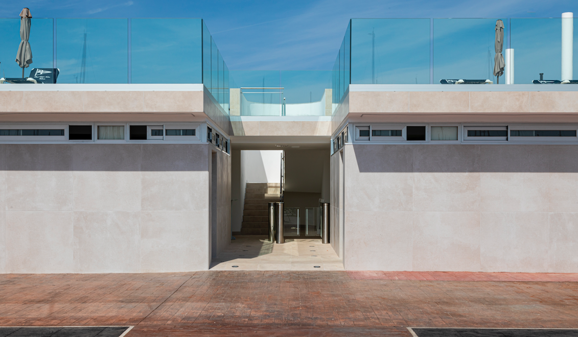 Las piezas de esta serie revisten la parte frontal del edificio, los vestuarios y también se utilizan como pavimento exterior en la piscina. Debido a su equilibrada destonificación, su carácter antideslizante y su textura inspirada en el cemento, las piezas blancas de este porcelánico dialogan con el mar mediante líneas abiertas y depuradas.