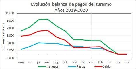 De la diferencia entre los ingresos y los pagos resulta un saldo por turismo hasta mayo de 4.803 millones de euros, por debajo de un tercio de los 15.970 millones de euros que se alcanzaron el año anterior, lo que supone un descenso de un 69,9%, con 11.167 millones de euros menos.
