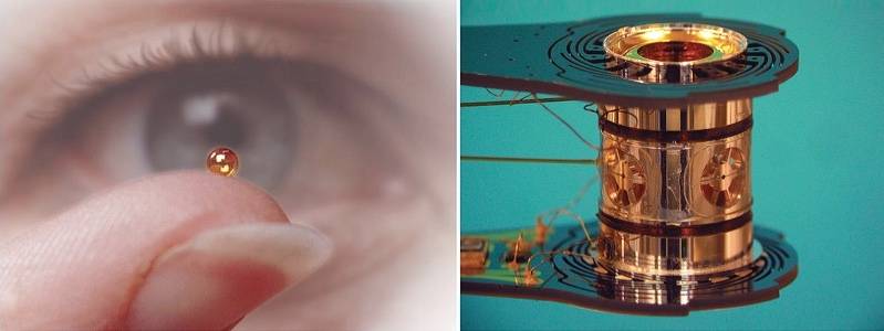Una micro­cáp­su­la, o micro­ba­llón, que se emplea como com­bus­ti­ble en el con­fi­na­mien­to iner­cial de fusión en el NIF y que se relle­na con una mez­cla de gas deu­te­rio y tri­tio en helio (izq.). Esa micro­cáp­su­la es la que se intro­du­ce en el hohl­raum (arri­ba, der.), cuyo con­te­ni­do implo­sio­na por el efec­to de pul­sos de los haces láser.