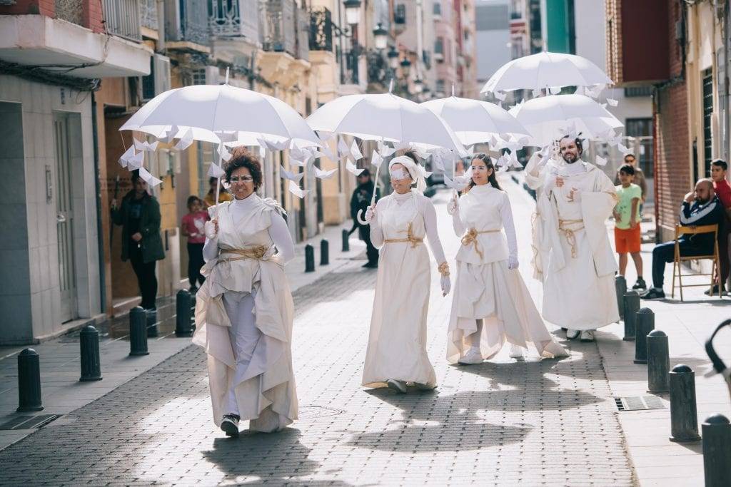 A lo largo de la mañana, el teatro de calle llegó de manos de la compañía castellonense Visitants. La performance estuvo presente con Vicente Arlandis, colaborador habitual de las actividades paralelas del centro, y de Mario Montoya, artista, docente y coordinador de los talleres de especialización Diàleg Obert, que forman parte de la vertiente formativa del TEM.