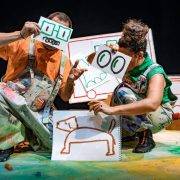 La propuesta es una invitación a despojarse de prejuicios y autocensuras, una historia dibujada en directo y colorida con pinceles y muchos cubos de pintura que llenan la escena de imaginación, expresión plástica y poesía.