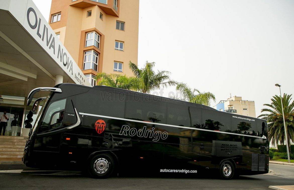 El auto­bús del Valen­cia a su lle­ga­da a Oli­va Nova Resort. Foto: VCF