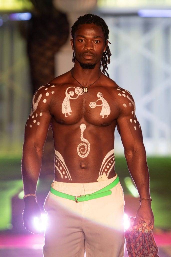 En la pasarela, un escenario espectacular entre palmeras y con ritmos africanos, los modelos mostraron estilo urbano en diferentes pases: Vaquero-Jeans, multicolor, blanco, y finalmente negro. Cerró el desfile un espectacular vestido de novia “sostenible” que recuerda los trajes africanos de rafia, todo hecho en seda. Es una creación del diseñador valenciano Rafa Sánchez, coordinador del desfile, y creador del diseño de los estilismos que se lucieron en el evento.