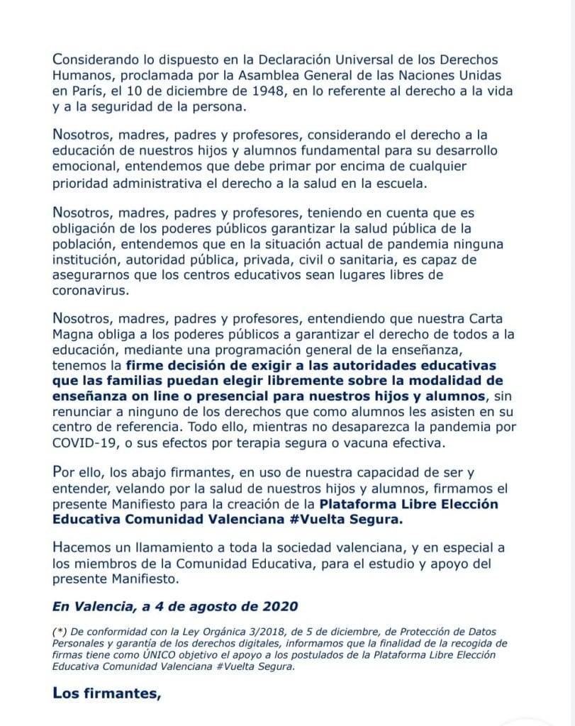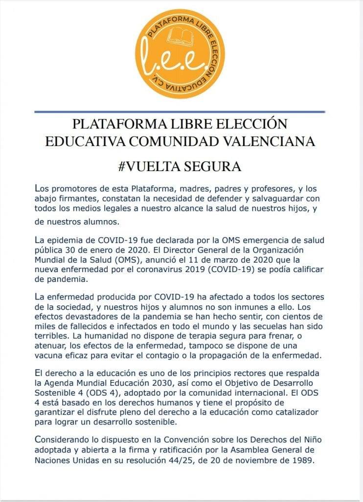 Los días van pasando y el 7 de septiembre, jornada fijada en el calendario para que se inicien las clases en la Comunidad Valenciana, está cada vez más cerca. Ante esta inminencia, y ante la gran cantidad de dudas que genera esta “vuelta al cole” tanto las asociaciones de familiares de alumnos como de profesores se están movilizando y están planteando todo tipo de medidas. Entre ellas está que se les permita elegir si sus hijos reciben clases presenciales, online o según un modelo mixto, como defienden desde la plataforma Libre Elección Educativa en la Comunitat Valenciana, que ha recibido ya el apoyo, entre otras personas y entidades, de Copava (Confederación Valenciana de Asociaciones de Padres de Alumnos).