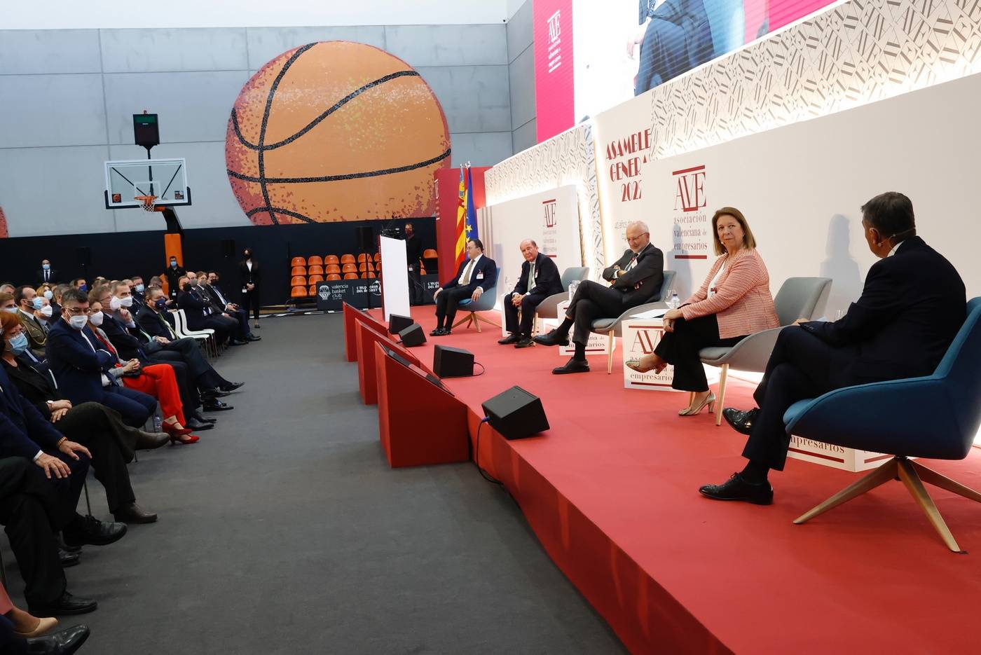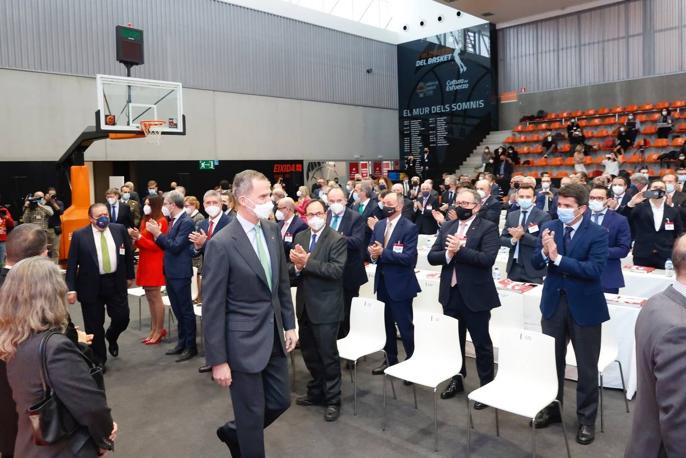 Don Felipe presidió en el L’Alqueria del Basket de Valencia, la clausura de la Asamblea General de la Asociación Valenciana de Empresarios (AVE), que aglutina a 165 empresarios de las tres provincias de la Comunidad Valenciana, que están al frente de las empresas líderes de los sectores más significativos del tejido productivo, que facturan el equivalente al 62% del PIB de la región y generan más de 295.000 puestos de trabajo.