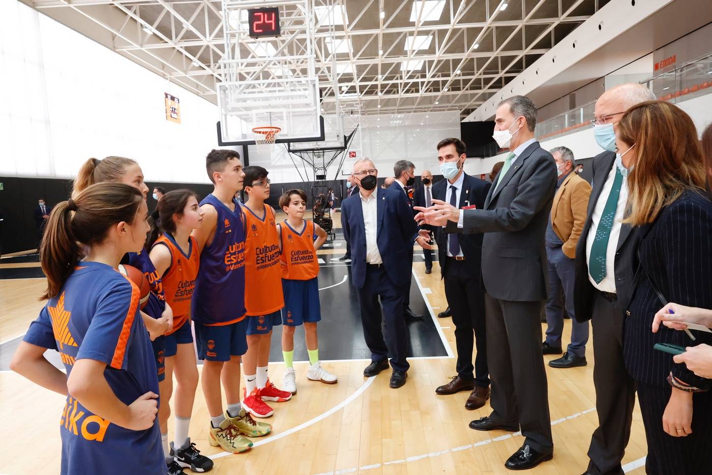 Para concluir, Don Felipe mantuvo un encuentro con los asistentes y realizó un recorrido por las instalaciones de L’Alquería del Basket y conversó con alumnos de la escuela de baloncesto. También pudo visitar el estado de las obras del futuro pabellón Valencia Arena.