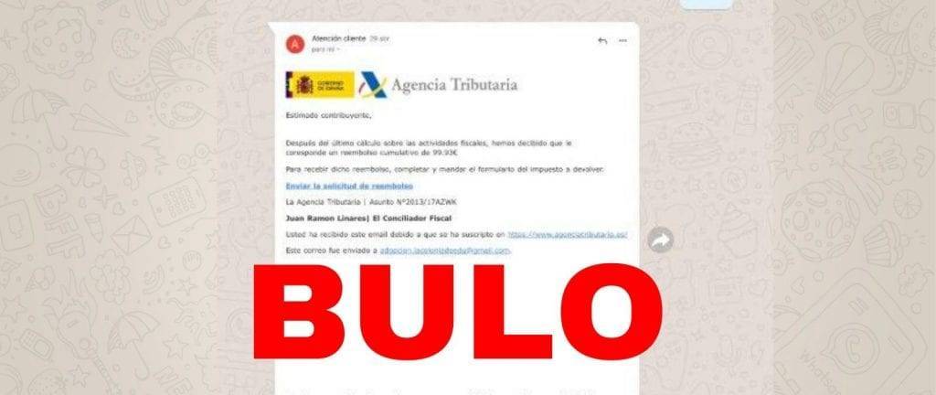 Nos habéis preguntado por un correo electrónico enviado supuestamente por la Agencia Tributaria (AEAT) en el que aseguran que “después del último cálculo sobre las actividades fiscales” han detectado que te “corresponde un reembolso acumulativo de 99,93€”. Pero ojo, es phishing, una técnica que intenta hacerse con tus datos.