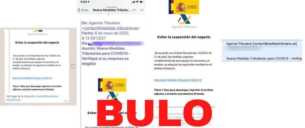 Nos habéis preguntado por un email que supuestamente es de la Agencia Tributaria con el asunto “Nueva Medidas Tributarias para COVID19 — Verifique si su empresa es elegible”. Dentro del mensaje aseguran que para “evitar la suspensión del negocio” tienes que descargarte un archivo adjunto y “enviarlo nuevamente firmado”. Es un bulo: se trata de un intento de phishing, una técnica que se utiliza para intentar hacerse con tus datos personales.
