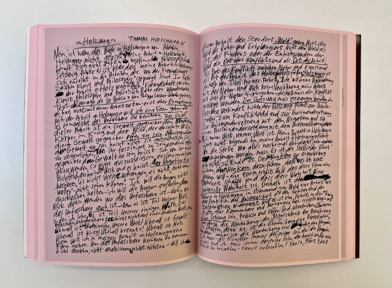 “V.C.R.T.” es una recopilación de escritos, dibujos, cartas, correos electrónicos y notas, que han acompañado en paralelo la obra de Thomas Hirschhorn desde sus inicios. Este contenido nunca fue publicado en su idioma y forma original. Además, una selección de 24 páginas se ha traducido al español por primera vez. Tal y como explica el autor: “Estas páginas siguen mis preguntas, mis investigaciones, mis afirmaciones. Marcan y atestiguan mi trayectoria en el campo del arte en sus interrogantes, sus exigencias y sus problemas” Y añade: “Al reunir en una publicación estas hojas dispersas, quiero afirmar mi misión y mi pasión como artista, que es: ¿cómo tomar una Posición? ¿Cómo dar Forma a esta Posición? ¿Cómo puede esta Forma ser una Forma universal? ¿Y cómo esta Forma universal puede tocar al otro a la altura de los ojos y más allá de los hábitos culturales, políticos, económicos y estéticos?”.