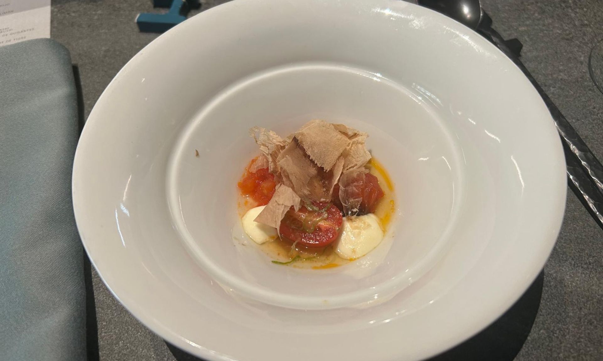 Tomate en texturas, dashi, queso Castelmagno y katsuoboshi