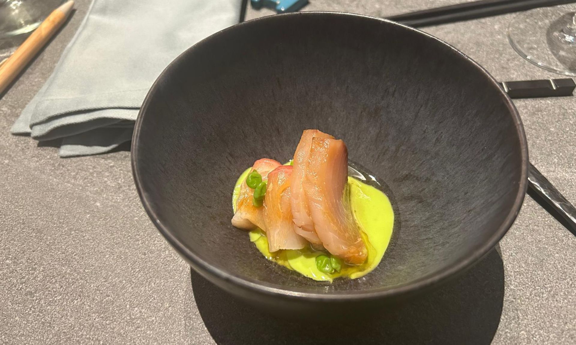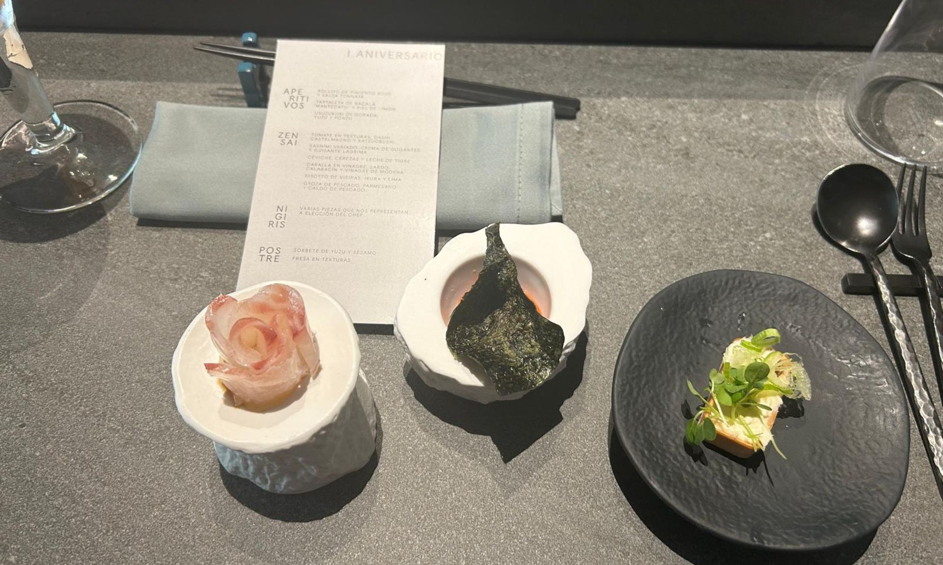 Aperitivos: usuzukuri de dorada, yozu y ponzu; rollito de pimiento rojo y salsa tonnata; tartaleta de bacalao “mantecato” y piel de limón