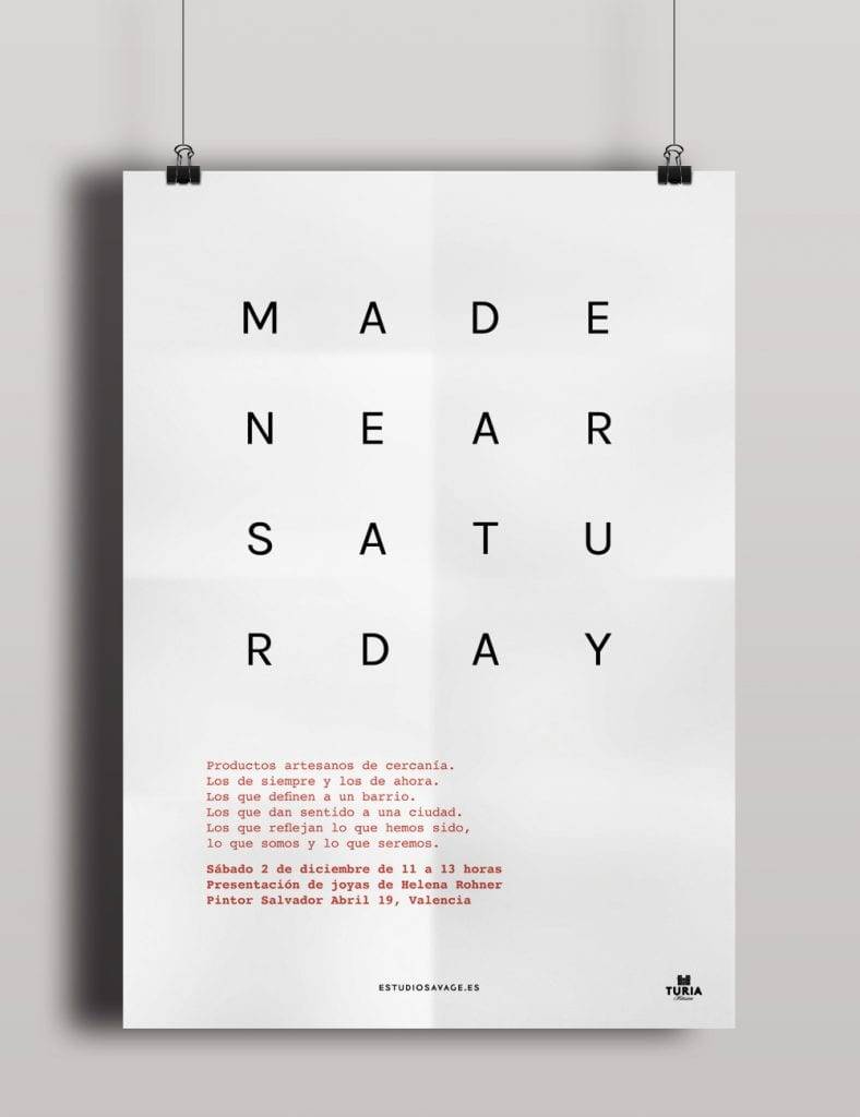 Se inauguran los Made Near Saturday de Estudio Savage con la presentación de la nueva colección de joyas de Helena Rohner para Estudio Savage el próximo sábado 2 de diciembre desde las 11:00 hasta las 13:00 horas en Pintor Salvador Abril 19 (Valencia), con la colaboración de Cerveza Turia.