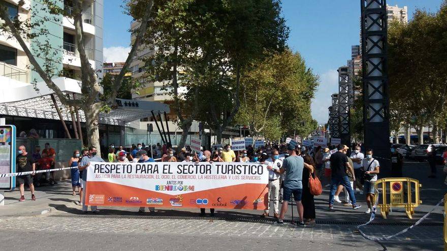 Pan­car­tas como “Beni­dorm des­tino segu­ro”, “res­pe­to para el sec­tor turís­ti­co”, “ayu­das al alqui­ler del local comer­cial” o “jus­ti­cia para la res­tau­ra­ción, el ocio, el comer­cio, la hos­te­le­ría y los ser­vi­cios”, mos­tra­ban el recha­zo y la preo­cu­pa­ción de los empre­sa­rios del sec­tor turís­ti­co.