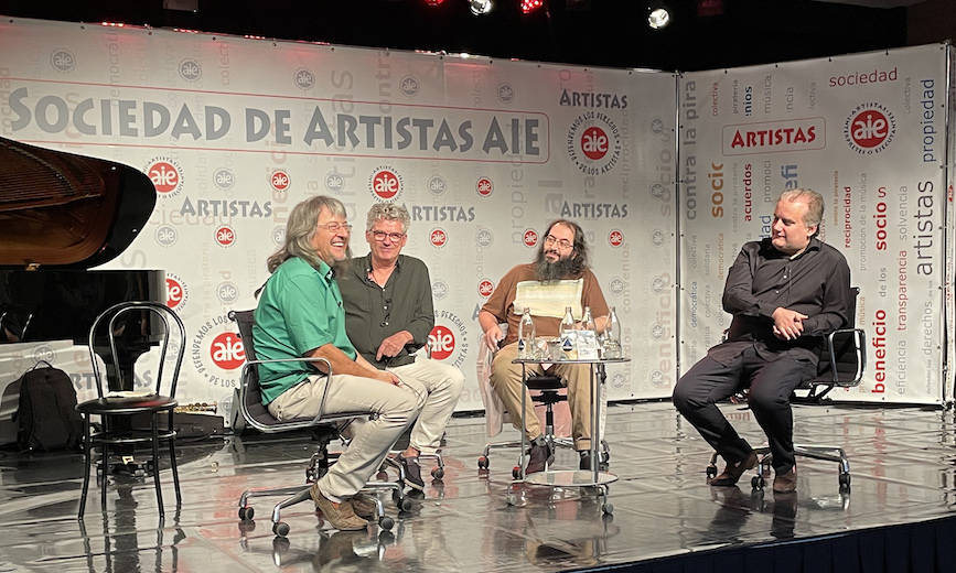 Pie de foto: De izquierda a derecha, Carlos Galán, Josep Lluís Galiana, Miguel Álvarez-Fernández y Josu de Solaun en el Auditorio de la Sociedad de Artistas AIE en Madrid.