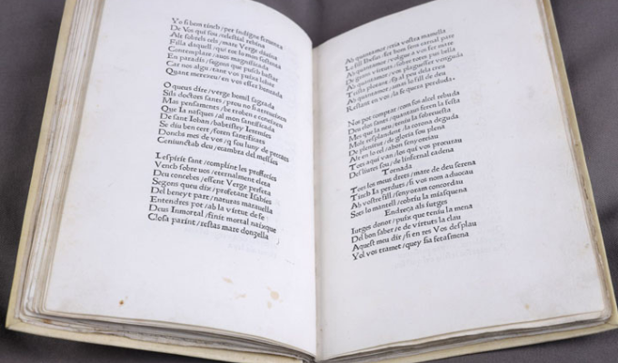 Obres o trobes en lahors de la Verge Maria. [València]: [Lambert Palmart], [1474]. Universitat de València. Biblioteca Històrica, BH CF/1. Fotografía de Eduardo Alapont.