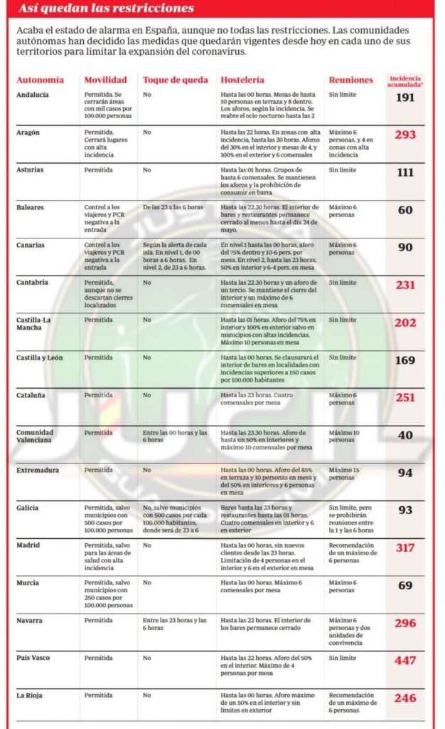 Así quedan las restricciones, de momento, en las diferentes comunidaes autónomas, salvo Canarias y Baleares cuya situación cambió, a la comentada en este artículo, en las últimas horas y aún podría evolucionar según las resoluciones pendientes.