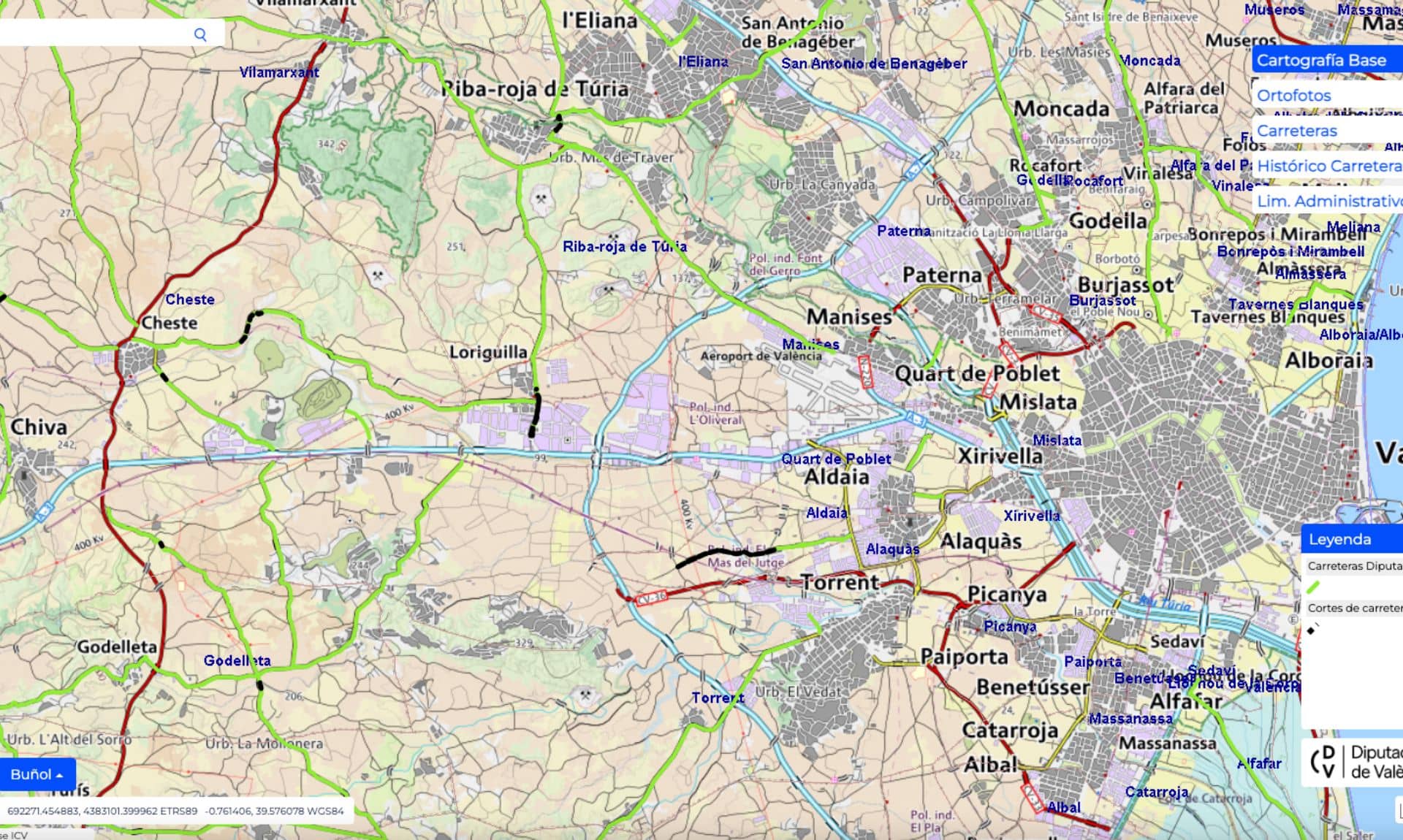 Un visor cartográfico alojado en el portal web de la Diputació de València (www.dival.es) permite que cualquier usuario pueda consultar el estado de la red provincial de carreteras, actualizado en tiempo real por el personal técnico de la institución. Esta herramienta informática cuenta con un potente buscador en el que se puede recabar información por municipios o denominación de carreteras, entre otros datos. Asimismo, entre sus funcionalidades incluye la posibilidad de mostrar cartografía del catastro o del ICV, así como ortofotos de la provincia.