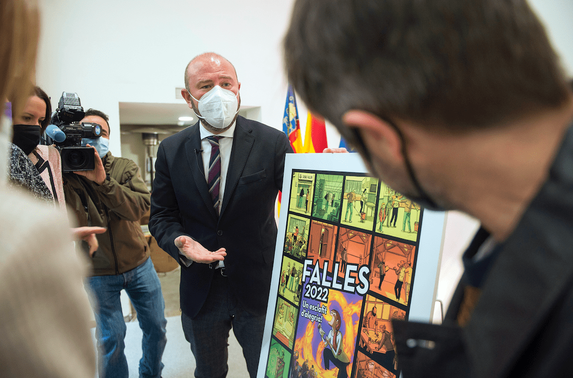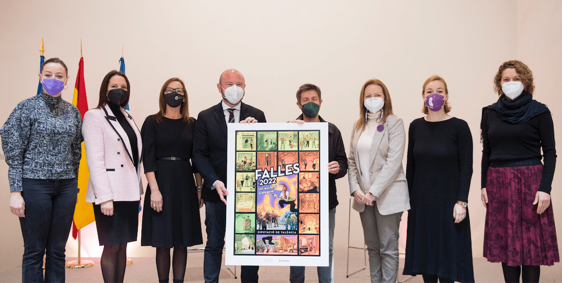 La Diputación de Valencia ha presentado este martes el cartel de Fallas 2022, elaborado por el dibujante e ilustrador valenciano Paco Roca, y que servirá de imagen para las fiestas falleras que se celebran en numerosos municipios de la provincia.