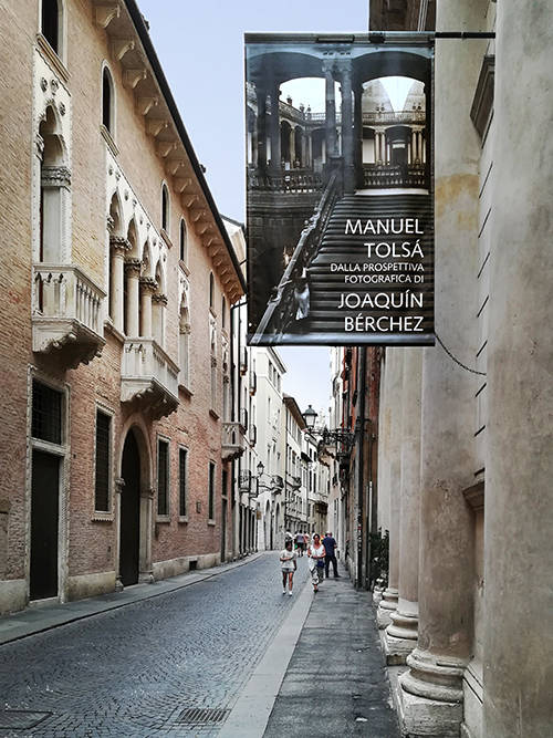 Ahora, en la Vicenza de Andrea Palladio, contemplamos muestras de estas fotografías en la inmediatez de la pancarta desplegada en medio de la via Contra’ Porti, en la entrada del Palazzo Barbaran da Porto, donde se aloja el prestigioso Centro Internazionale di Studi di Architettura Andrea Palladio. Este, para la portada del último número su revista Annali di Architettura, seleccionó precisamente, una de las fotografías que ahora se exponen en su sede y argumenta la pancarta de la exposición: Eurídice desciende definitivamente al mundo de los muertos, donde “se despliega una escalinata tolsiana que destila atemporal clasicismo y sutil cinematografía”.