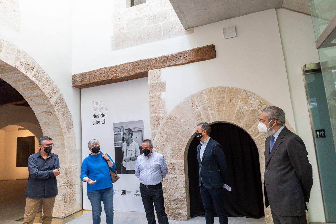 El director del Consorci de Museus de la Comunitat Valenciana, José Luis Pérez Pont y el presidente de la Fundación Chirivella Soriano, Manuel Chirivella, acompañados por los comisarios, Francesc Vera y Manel Baixauli y la viuda del artista, Rosa Urenya presentaron la muestra “Des del silenci” en torno a la obra del pintor valenciano Enric Banyuls (Corbera, 1954 – 2018).