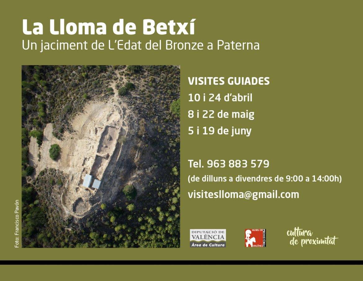 Un año más, el Museu de Pre­his­tò­ria de Valen­cia ofre­ce visi­tas guia­das a la Llo­ma de Betxí los sába­dos 10 y 24 de abril, 8 y 22 de mayo, y 5 y 19 de junio. Se tra­ta de un yaci­mien­to arqueo­ló­gi­co de la Edad del Bron­ce, un peque­ño pobla­do, ubi­ca­do al bor­de del río Turia y en medio del para­je de la Valle­sa de Man­dor, en Pater­na. Es cono­ci­do des­de 1928, y ha sido exca­va­do entre 1984 y 2013, casi trein­ta cam­pa­ñas de tra­ba­jo por par­te del Ser­vi­cio de Inves­ti­ga­ción Pre­his­tó­ri­ca (SIP) de la Dipu­tación de Valen­cia, bajo la direc­ción de Maria Jesús de Pedro, actual direc­to­ra del museo.