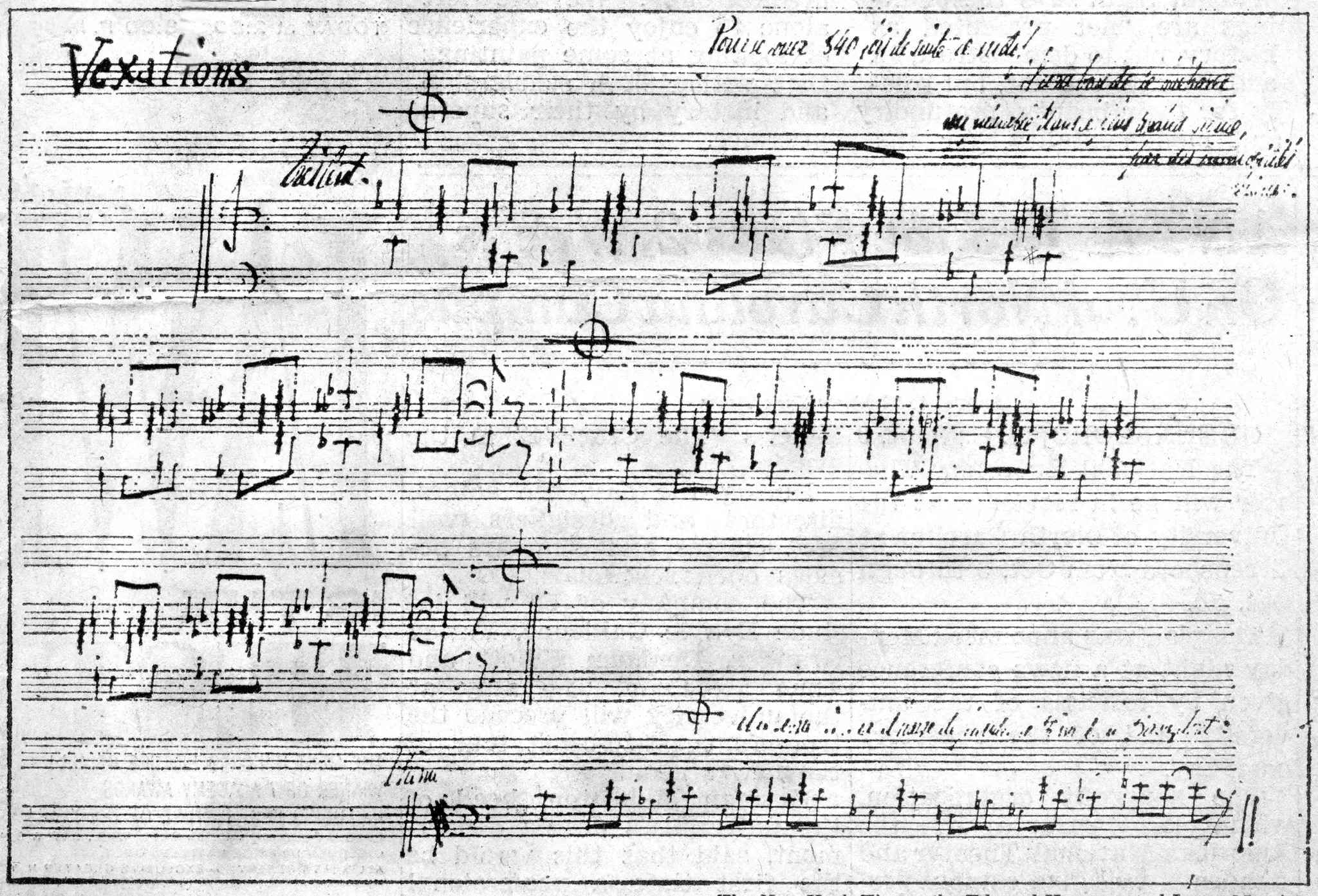 En 1893, en París, el compositor Erik Satie creó con 33 años una pieza para piano solo titulada Vexations. En la partitura original se pide al intérprete que la ejecute 840 veces seguidas y se le advierte de la necesidad de prepararse con antelación en el más profundo silencio, para la más intensa inmovilidad.