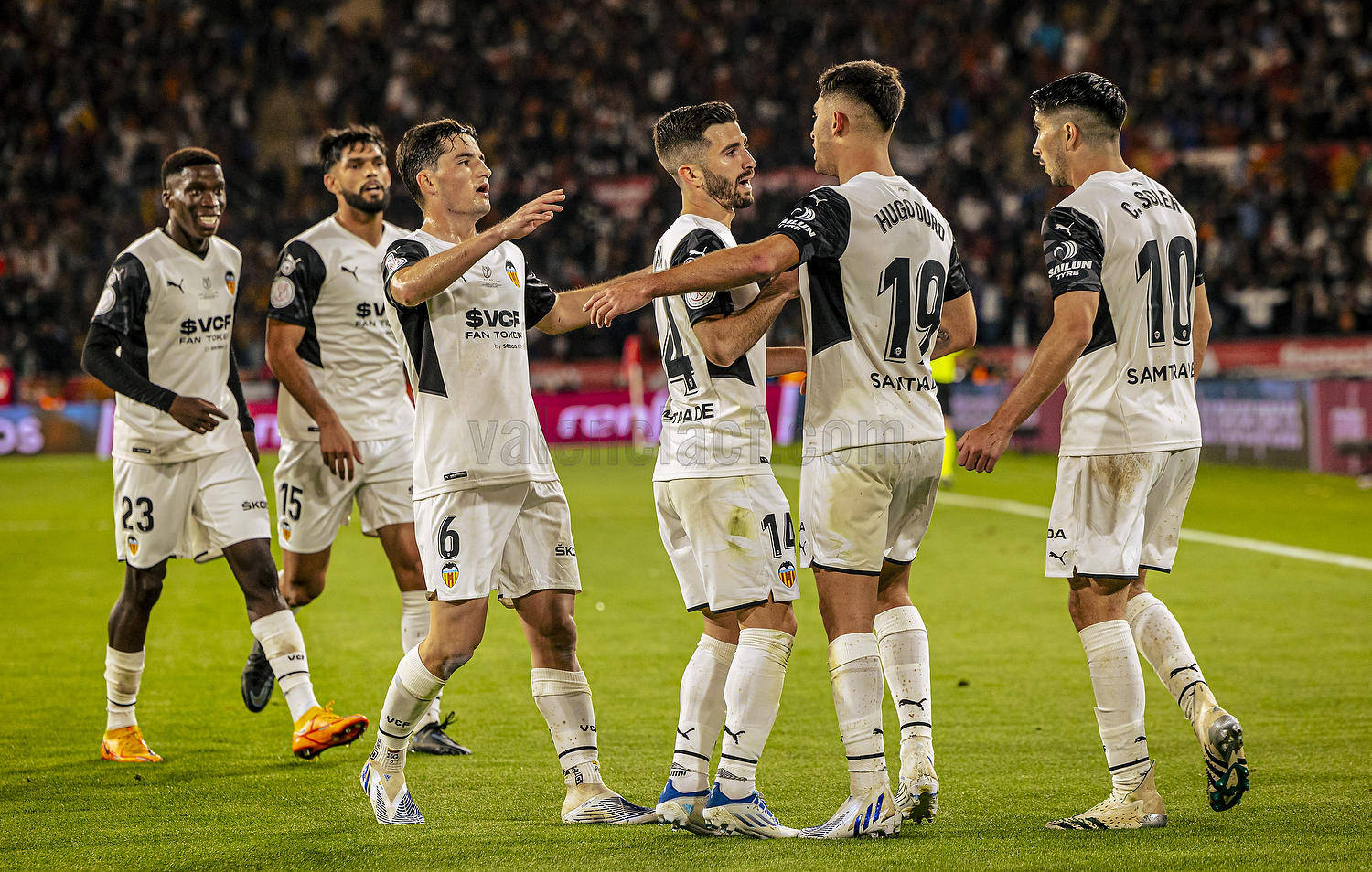 Los jugadores del Valencia celebran el gol del empate de Hugo Duro.