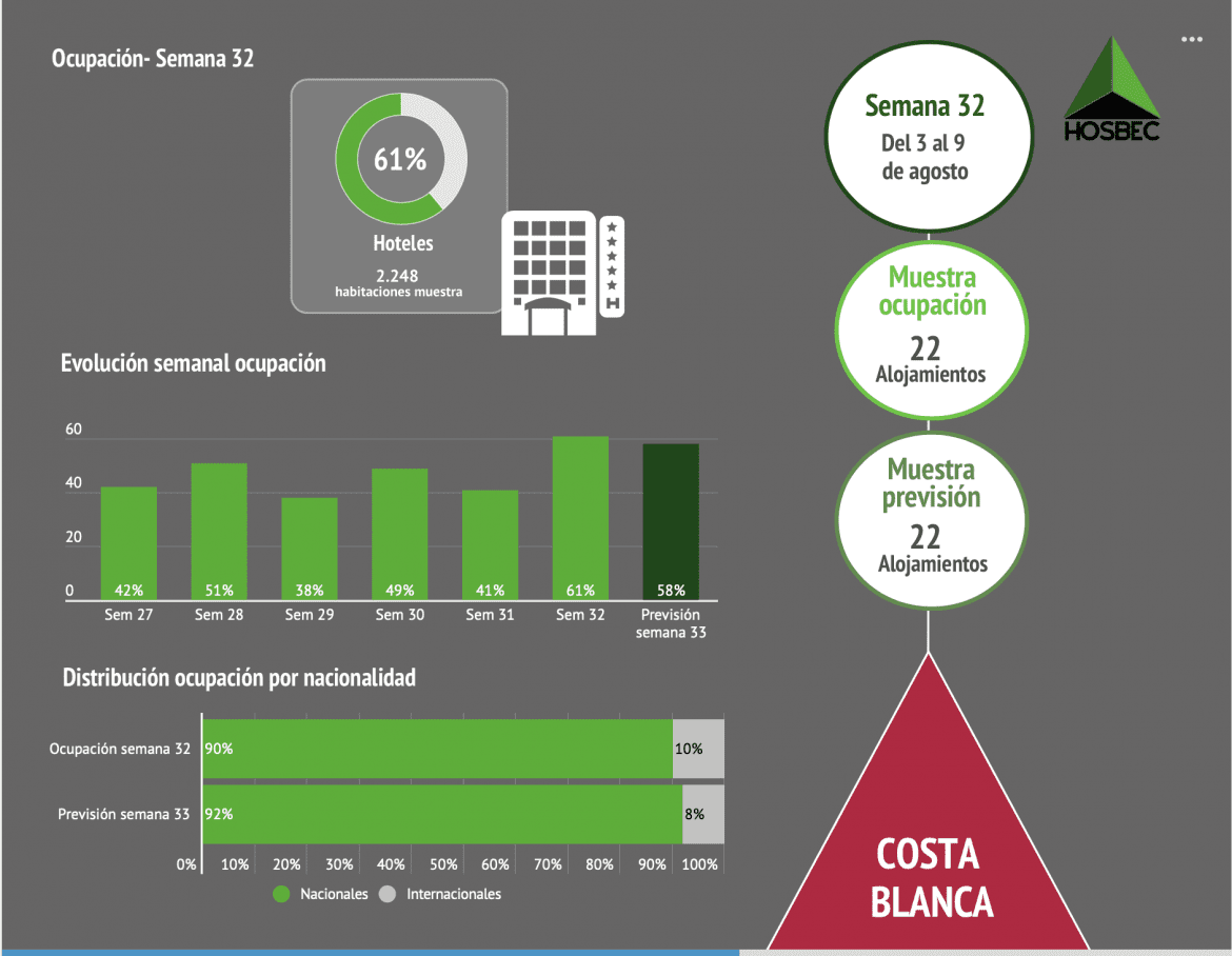 La ocupación hotelera durante esta primera semana de agosto ha oscilado entre el 61% de los hoteles de la Costa Blanca, pasando por el 46% de Benidorm, el 44% de la ciudad de Valencia y el 45% en Castellón. Y estos resultado se han construido prácticamente desde el mercado nacional ya que la presencia de turistas extranjeros es testimonial y se sitúa entre el 10 y 20% del total (según zonas).