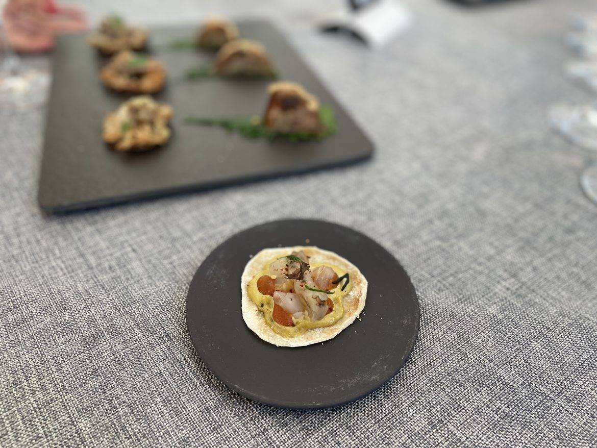 “Tam­bién hemos degus­ta­do el tra­di­cio­nal cal­de­ro de dora­da y lan­gos­tino del Mar Menor”, expli­ca el chef. Algu­nos peque­ños boca­dos que tam­bién han pro­ba­do los invi­ta­dos han sido el mar­mi­ta­co de morri­llo de atún rojo sobre una hoja de shi­so en for­ma de taco o un molle­te de cabri­to lechal relleno de cha­pi­nas (molle­jas).