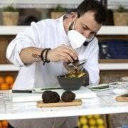 El chef valen­ciano Ale­jan­dro Pla­te­ro pre­pa­ra la tapa coro­na­da con tru­fa.