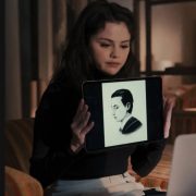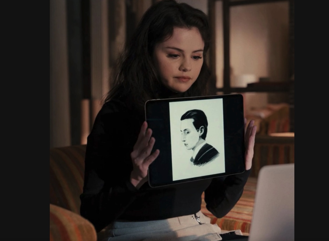 Selena Gomez, con uno de los bocetos de Laura Pérez en la primera temporada de «Solo asesinatos en el edificio».