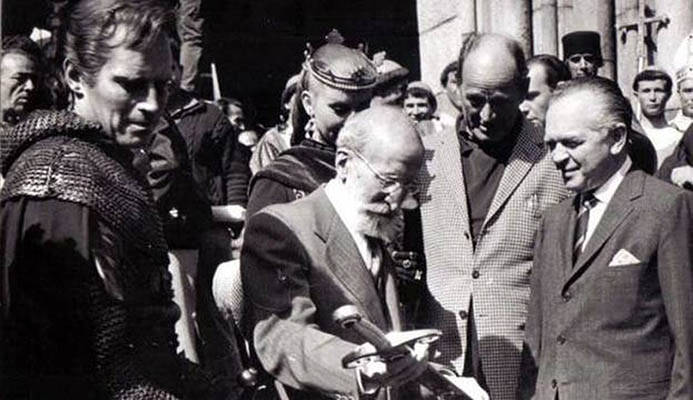 Menén­dez Pidal visi­ta el roda­je del Cid en Peñís­co­la, corre el año 1961.