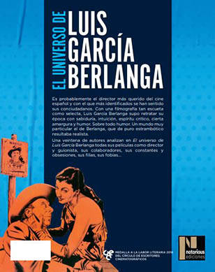 He colaborado –un honor para mí– en la edición del volumen El universo de Luis García Berlanga (Notorious), obra colectiva que llegó a las librerías a finales del pasado mayo. Los expertos que analizan las películas del cineasta valenciano en este libro son Kepa Rojo (Esa pareja feliz, 1951, con Bardem); ¡Bienvenido, Mister Marshall!, 1952 (Fernando R. Lafuente); Novio a la vista, 1953 (Juan Carlos Vizcaíno); Calabuch, 1956 (Noemi Guillermo); Los jueves, milagro, 1957 (Víctor Matellano); Plácido, 1961 (Gerardo Sánchez); el episodio de Las cuatro verdades (Joaquín Vallet Rodrígo); El verdugo, 1963 (José Luis Sánchez Noriega); La boutique, 1967 (Diego Moldes); ¡Vivan los novios!, 1970 (Adrián Sánchez); La escopeta nacional, 1978 (Juan Carlos Laviana); Patrimonio Nacional, 1981 (Lucía M. Cabanelas); Nacional-III, 1982 (Lucía Tello); La vaquilla, 1985 (Moisés Rodríguez); Moros y Cristianos, 1987 (José Ignacio Wert Moreno); Todos a la cárcel, 1993 (Jesús Antonio López); París-Tombuctú, 1999 (David Felipe Arranz). En este libro de gran formato, con un prólogo de Sol Carnicero (coordinadora para la Academia de Cine del Año Berlanga), amplio despliegue gráfico, una encuesta y numerosos textos temáticos, mi comentario fue sobre la película Tamaño natural, 1973.