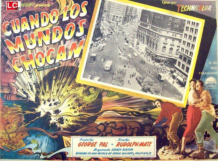 Miércoles 10-XI. Cuando los mundos chocan (Rudolph Maté, 1951). Estreno en España, en 1954. Creo que la vi en el Mundial. Es una buena película con argumento y estética de tebeo futurista que contemplé entonces con el ánimo sobrecogido. Y ahora un poco también, a causa de la grave amenaza del cambio climático. Sinopsis argumental: Una estrella gigante está a punto de chocar con la Tierra, lo que inevitablemente provocaría el fin del mundo. El Gobierno (USA, por supuesto) rehúsa escuchar a los científicos, pero un grupo de empresarios financia la construcción de una nave espacial con el fin de transportar a un número limitado de personas (seleccionadas con criterios razonables) a otro planeta para crear allí una nueva civilización. Los viajeros tendrán que luchar contra el discurrir del tiempo y contra el pánico de los que están condenados a quedarse en la Tierra.