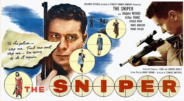 Anoto en este diario las dos exóticas películas que he visto estos últimos días: The Sniper (Edward Dmytryk, 1952) y Mil caras tiene el amor (Alexander Singer, 1965). The Sniper es una de las mejores películas de Dmytryk (curioso apellido: siete consonantes y ninguna vocal), y también una de las menos conocidas de su larga carrera (32 películas realizadas entre 1942 y 1975). Cine negro y thriller psicológico sobre el repartidor de una tintorería, replegado en su soledad, que asesina con un fusil de mira telescópica a mujeres elegidas al azar, en venganza a causa de haber sido despreciado por ellas toda la vida. Una dura y lacónica película de 87 minutos.