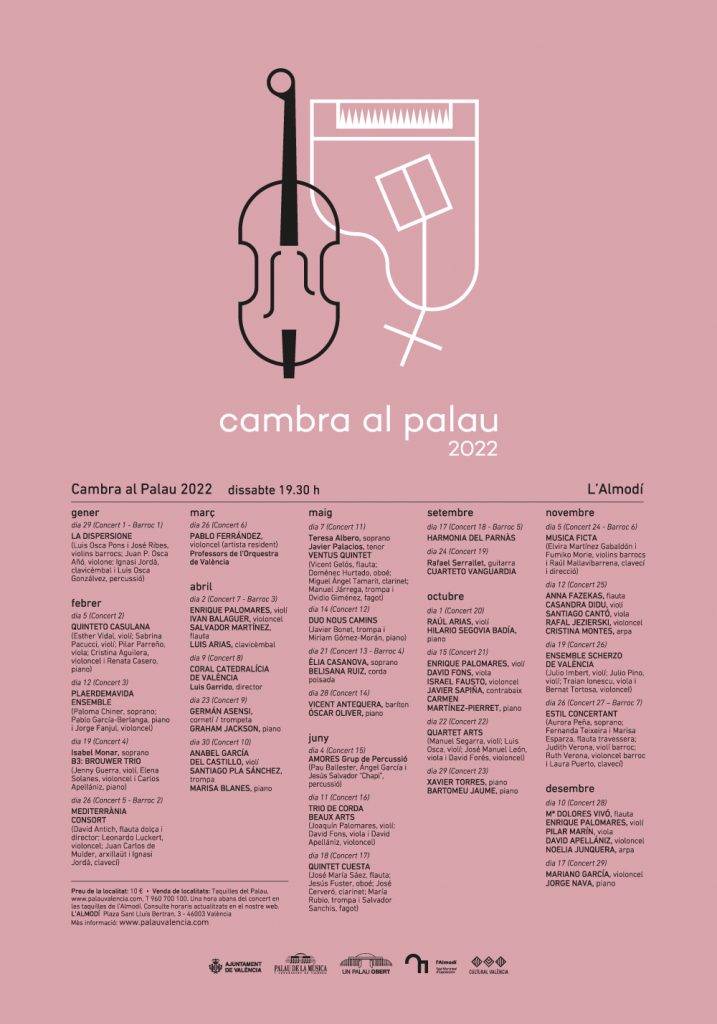 El director del Palau, Vicent Ros, ha detallat la programació, i ha valorat “la consolidació, en plena pandèmia i en este espai extern, L’Almodí, d’esta sèrie extensa de concerts, de caràcter estable i altíssima qualitat musical, i amb un públic molt fidel i agraït”. Ros ha assegurat que “Cambra al Palau” s’ha instal·lat com el cicle de música de cambra “més extens, treballat i estable de la ciutat”.
