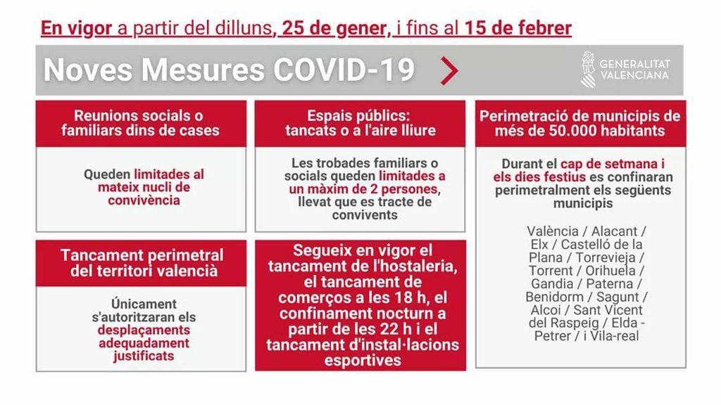 Las nuevas medidas entrarán en vigor a partir de este lunes, día 25 de enero, cuando se publique en el Diari Oficial de la Generalitat y permanecerán en principio hasta el 15 de febrero.