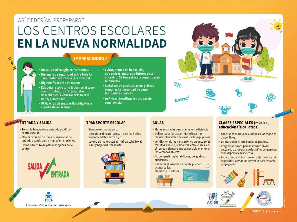 Con muchas dudas e inclu­so inse­gu­ri­dad, la comu­ni­dad edu­ca­ti­va se va a enfren­tar a uno de los cur­sos más com­pli­ca­dos. Con el obje­ti­vo de dar las reco­men­da­cio­nes sani­ta­rias más acer­ta­das e inten­tar redu­cir el ries­go de con­ta­gio, la Aso­cia­ción Nacio­nal e Inter­na­cio­nal de Enfer­me­ría Esco­lar (AMECE) y la Aso­cia­ción Cien­tí­fi­ca Espa­ño­la de Enfer­me­ría y Salud Esco­lar (ACEESE), jun­to al Ins­ti­tu­to Espa­ñol de Inves­ti­ga­ción Enfer­me­ra y el CGE, han lan­za­do el Plan estra­té­gi­co de enfer­me­ría esco­lar para la pre­ven­ción COVID-19 en los cen­tros edu­ca­ti­vos y la Guía de reco­men­da­cio­nes para el reini­cio de las cla­ses en los cen­tros edu­ca­ti­vos, res­pec­ti­va­men­te.