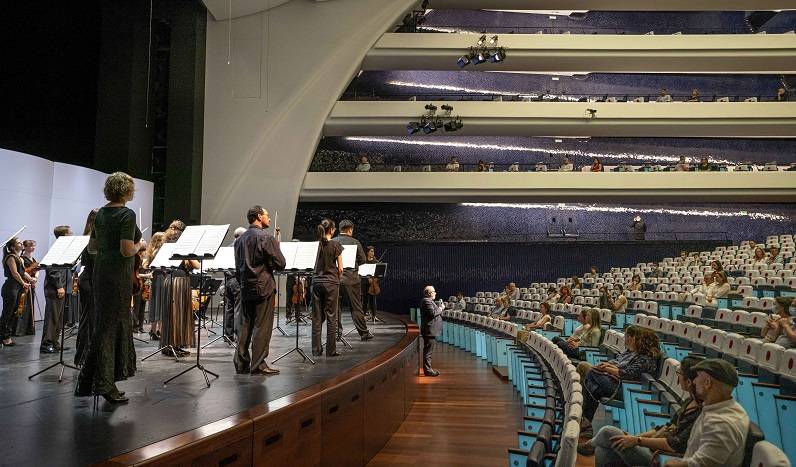 Minuto de silencio el Les Arts por los fallecidos a causa de la pandemia, ocasionada por el COVID-19, momentos antes de dar comienzo el primer concierto que se celebra en el Palau de Les Arts Reina Sofía. Un concierto homenaje a los sanitarios que han luchado contra el coronavirus en esta comunidad. @artsfotografia