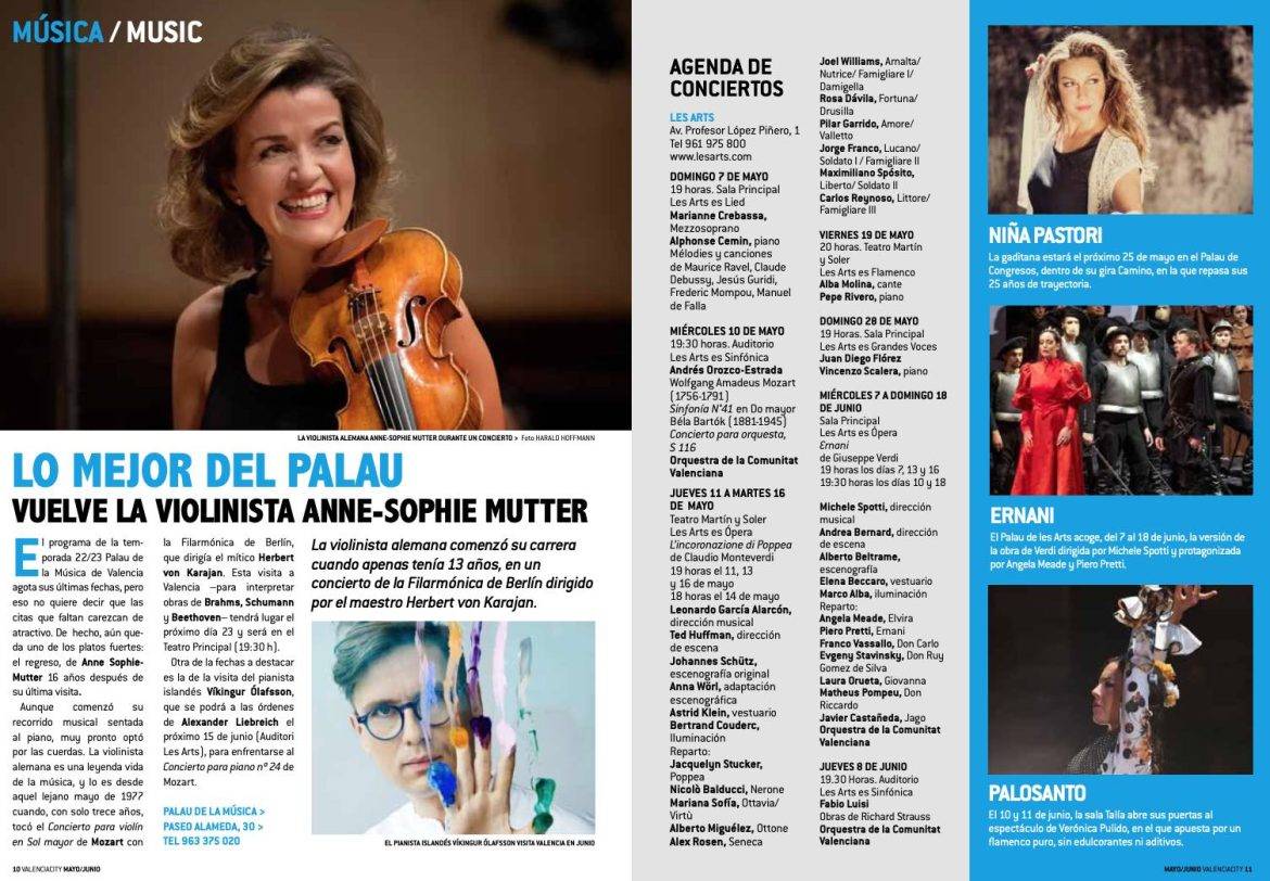 Por lo que res­pec­ta a las pági­nas de Cul­tu­ra, en Valen­cia City des­ta­ca­mos la visi­ta que hará al Tea­tro Prin­ci­pal el 23 de mayo la vio­li­nis­ta ale­ma­na Anne-Marie Mut­ter, 16 años depués de su últi­ma visi­ta, y el regre­so de la ban­da bri­tá­ni­ca Chi­na Cri­sis, una de las refe­ren­cias de la músi­ca New Age de los 80. Niña Pas­to­ri, Veró­ni­ca Puli­do o la ópe­ra Erna­ni son otras de nues­tras pro­pues­tas.