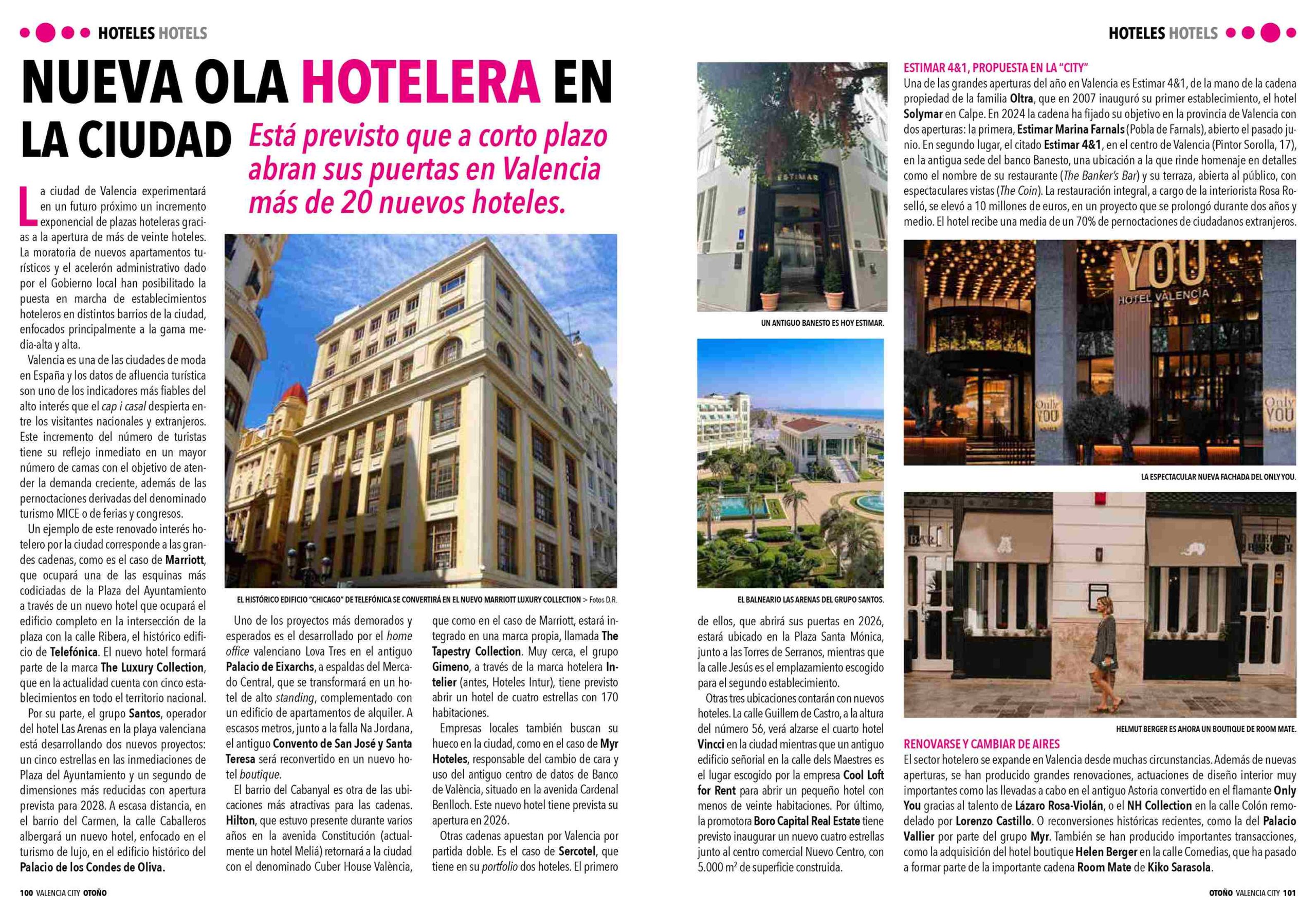 Valencia y su crecimiento notable de establecimientos hoteleros es el tema principal, y en portada, de la última edición en papel de la revista Valencia City, la guía decana de la ciudad. El interior del nuevo hotel Estimar que se ha inaugurado en plena city de Valencia (Pintor Sorolla, 17) es el protagonista de la foto de portada.