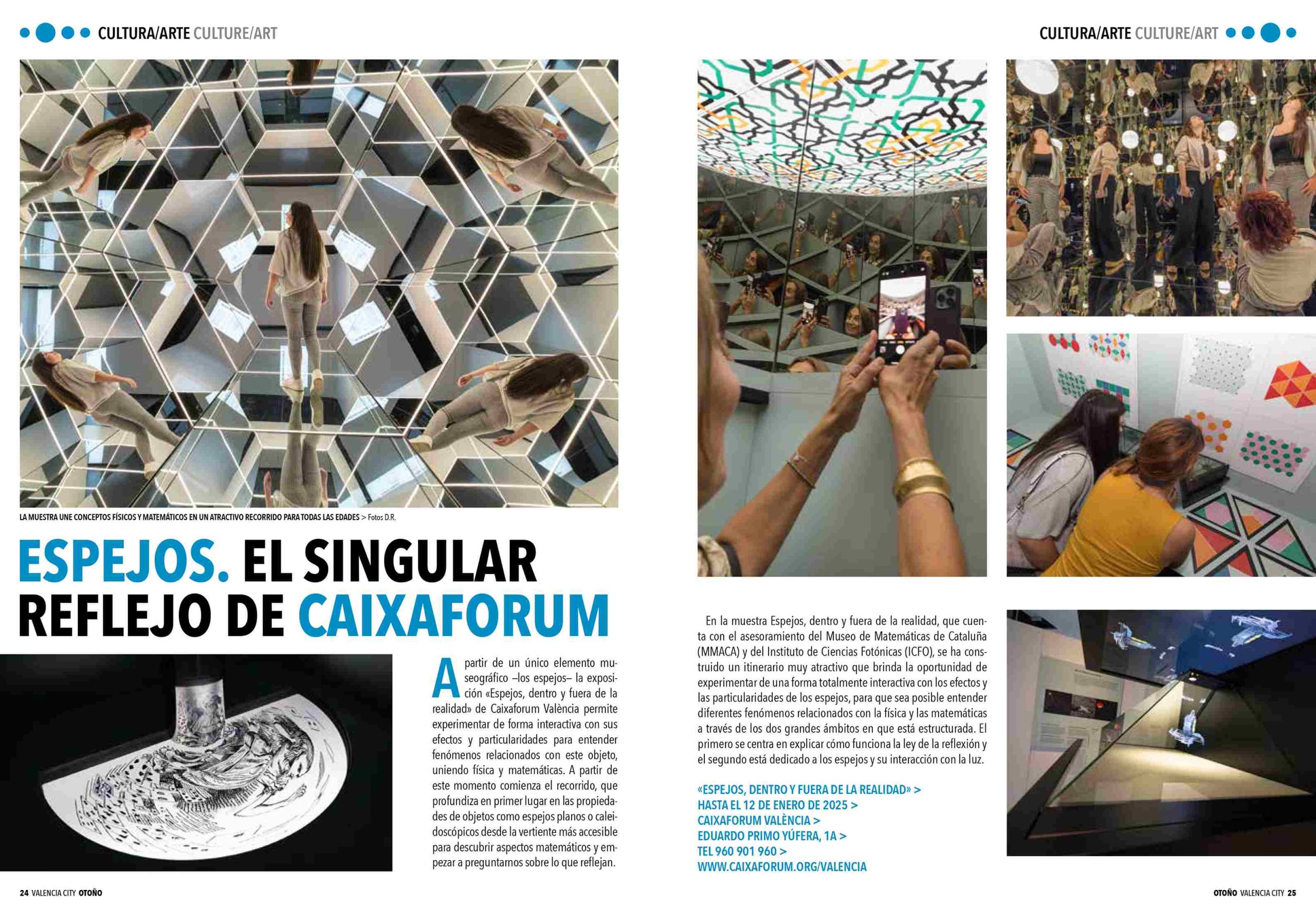 Por otra parte, la exposición Espejos, dentro y fuera de la realidad, de Caixaforum Valencia, también es protagonista en las páginas principales de la sección cultural de la última edición de Valencia City. La muestra permite experimentar de forma interactiva con sus efectos y particularidades para entender fenómenos relacionados con este objeto, uniendo física y matemáticas.