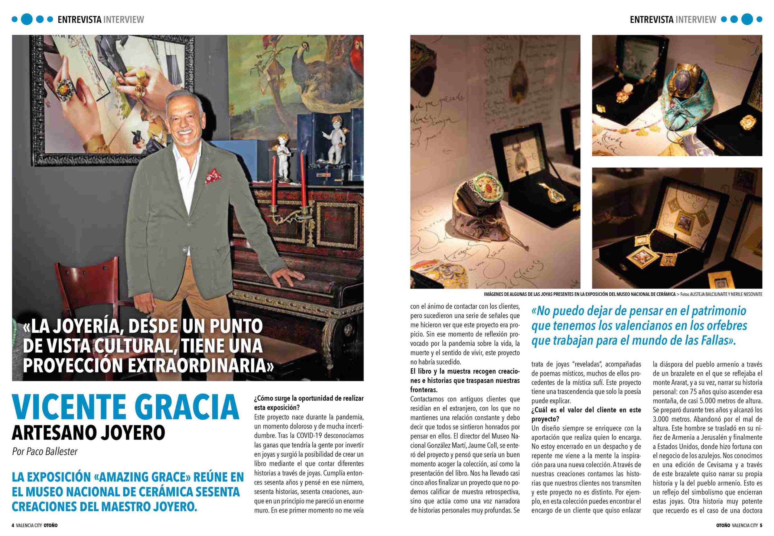 Como es habitual y prioritario, Valencia City pone el foco en las muestras y colecciones culturales más importantes de la ciudad. En esta caso, la entrevista principal de esta edición es al prestigioso artesano joyero Vicente Gracia, que reúne en su exposición Amazing Grace sesenta creaciones en el Museo Nacional de Cerámica ubicado en el palacio del Marqués de Dos Aguas.